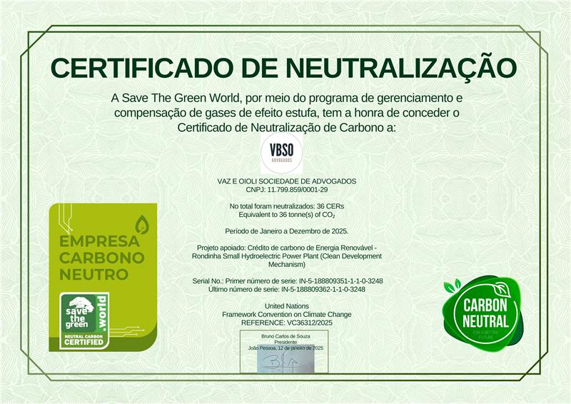 As a result of this initiative, VBSO Advogados received the Carbon Neutralization Certificate from SaveTheGreen. The agency works exclusively with internationally recognized carbon credits, ensuring that our investment supports high-quality projects that genuinely contribute to reducing global greenhouse gas emissions.