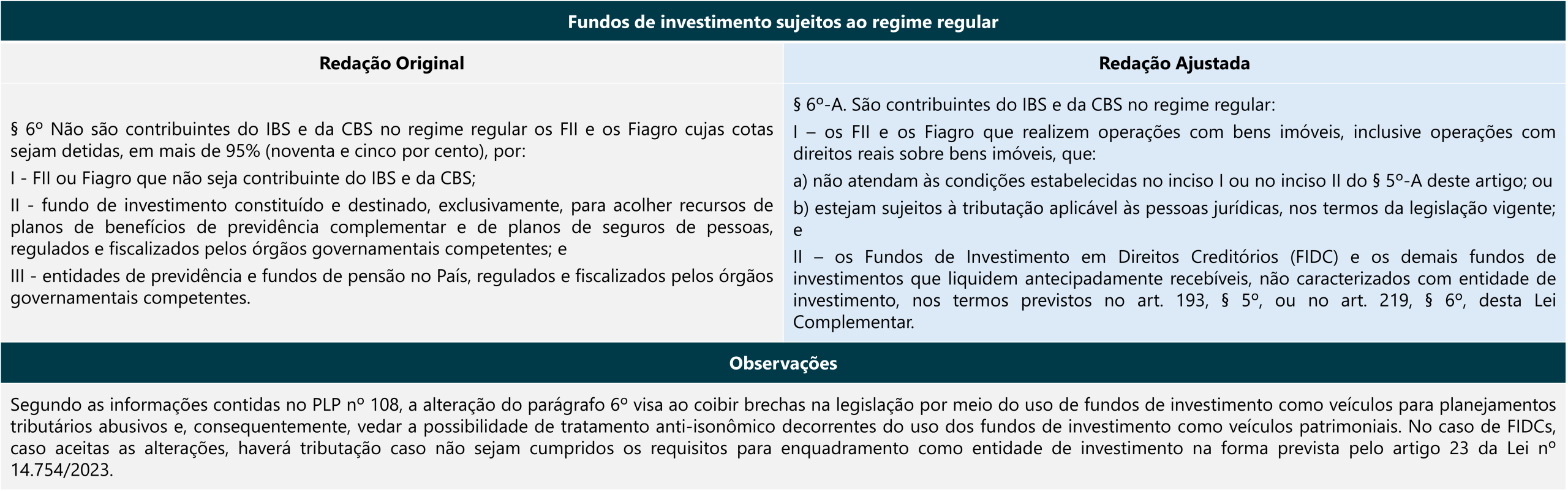 A versão aprovada do PLP 108 retoma parte do tratamento voltado para fundos de investimento que foi originalmente vetado. Com isso, certos fundos de investimento podem, a depender das circunstâncias, ser enquadrados como contribuintes desses novos tributos. É o caso dos fundos de investimento imobiliário (FII), fundos de investimento em cadeias produtivas do agronegócio (Fiagro) e fundos de investimento em direitos creditórios (FIDC), que poderão ser tributados. Abaixo, detalharemos como as previsões propostas pelo PLP 108 relacionadas a esse tema: