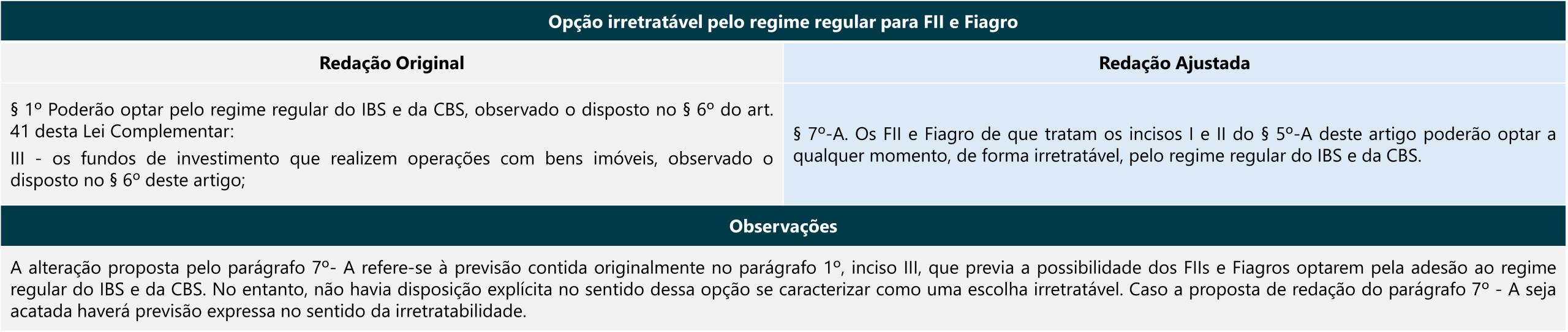 • Opção Irretratável pelo Regime Regular: permite a FIIs e Fiagros optarem (de forma irretratável) pelo regime regular de tributação IBS/CBS. Essa alternativa deve ser avaliada considerando que a opção pode viabilizar a utilização de créditos em relação à aquisições de bens e serviços realizadas pelo fundo.