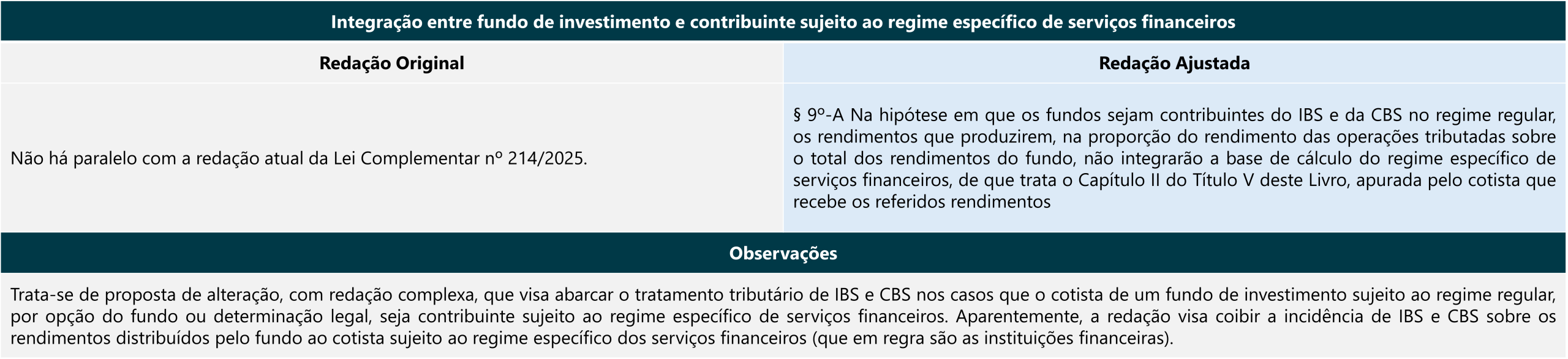 • Integração com regime de serviços financeiros: evita duplicidade de tributação para cotistas sujeitos ao regime específico de serviços financeiros, excluindo rendimentos já tributados do cálculo para instituições financeiras.